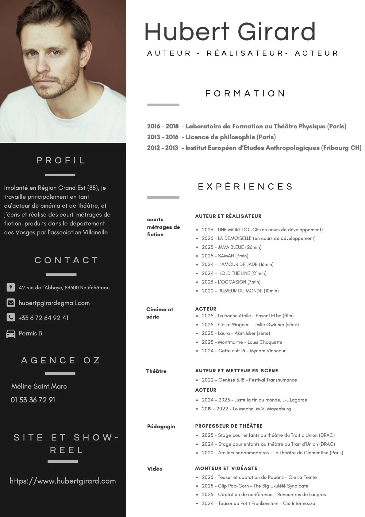 Actif sur plusieurs fronts, j’interviens régulièrement comme vidéaste et monteur pour des compagnies de théâtre et des groupes de musique. Parallèlement, je transmets ma passion pour le jeu en officiant comme professeur de théâtre auprès d'enfants et d'adolescents, les accompagnant dans le travail de l'acteur et la mise en scène de spectacles. Basé dans le Grand Est , je poursuis ce développement de projets pluridisciplinaires, représenté par Méline Saint Marc au sein de l'Agence OZ.